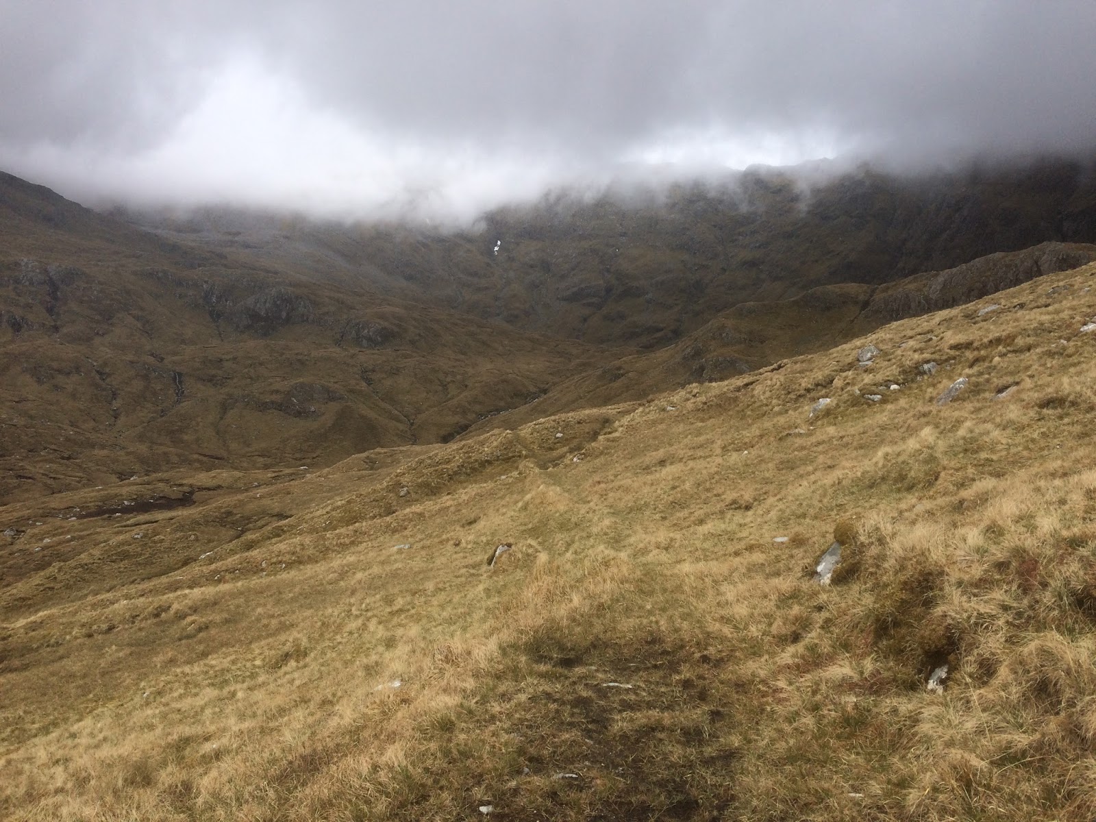 After 2 eggs for breakfast I walked along the road for a couple of miles from the hostel, and turned into the forest and made my way across moors, contoured and then descended into Glen Douchary, passing through some ruins before I crossed the river.